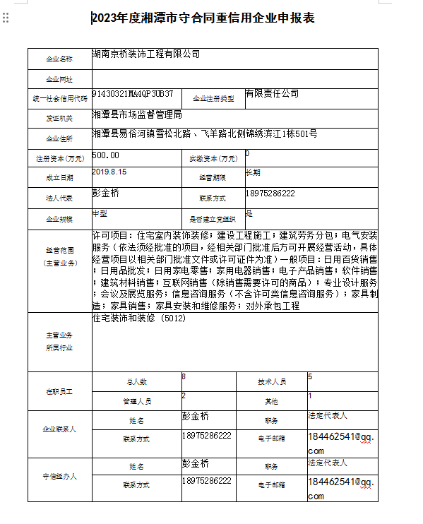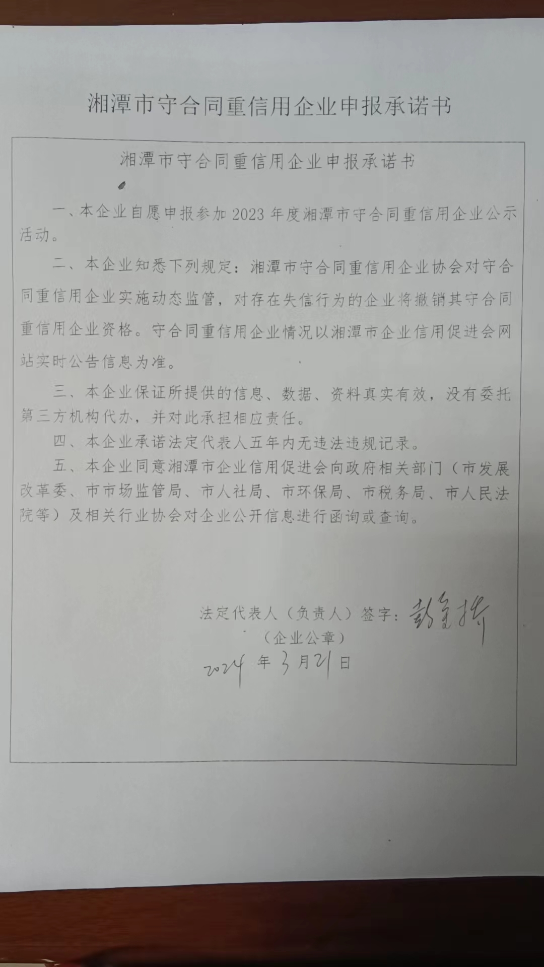 本企業(yè)根據(jù)《湘潭市守合同重信用企業(yè)申報(bào)規(guī)定》等編制 2023 年度企業(yè)信用報(bào)告書(shū),并保證本報(bào)告書(shū)內(nèi)容真實(shí)、準(zhǔn)確、完整。