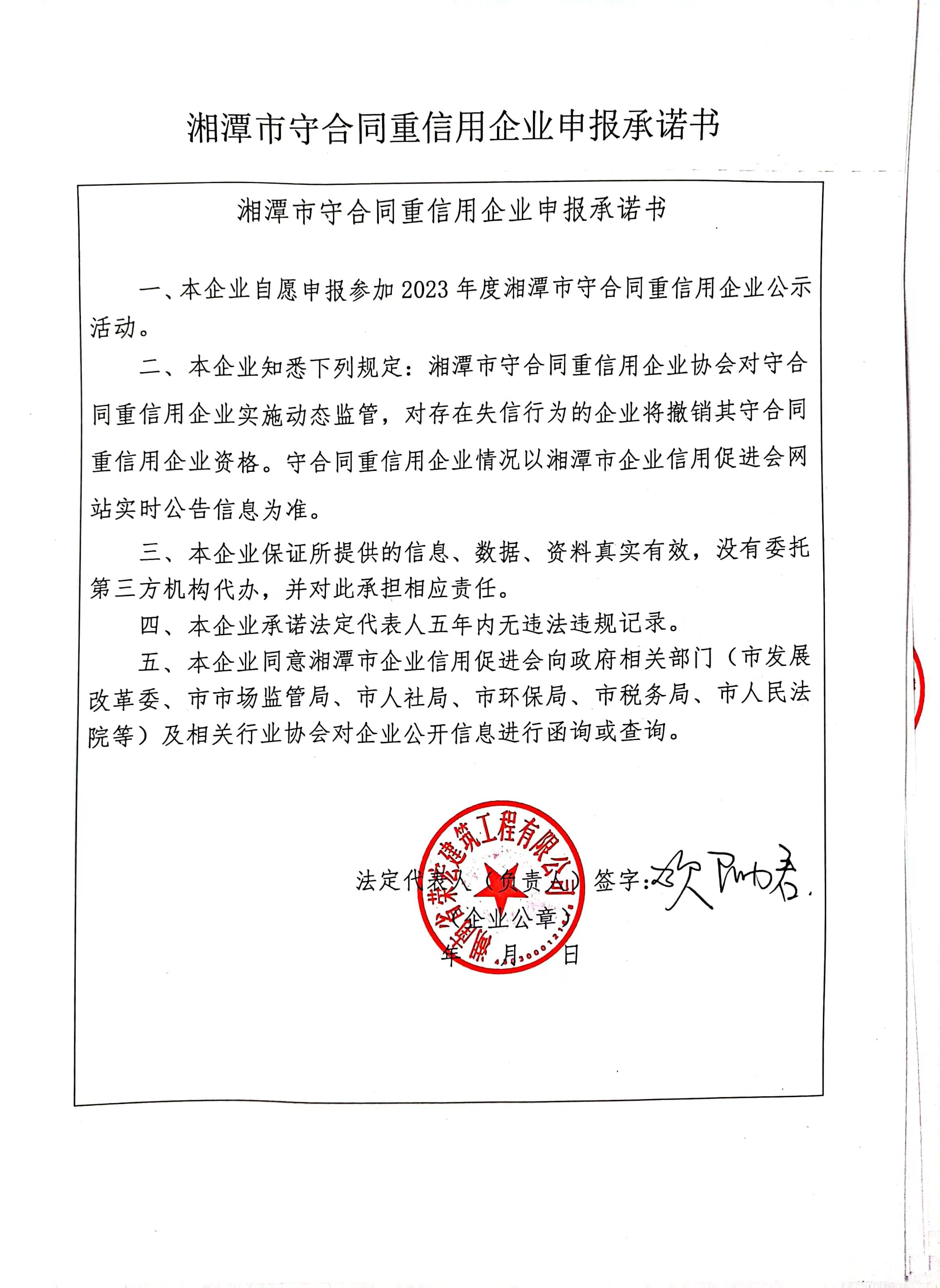 本企業(yè)根據(jù)《湘潭市守合同重信用企業(yè)申報規(guī)定》等編制 2023 年度企業(yè)信用報告書,并保證本報告書內(nèi)容真實、準確、完整。