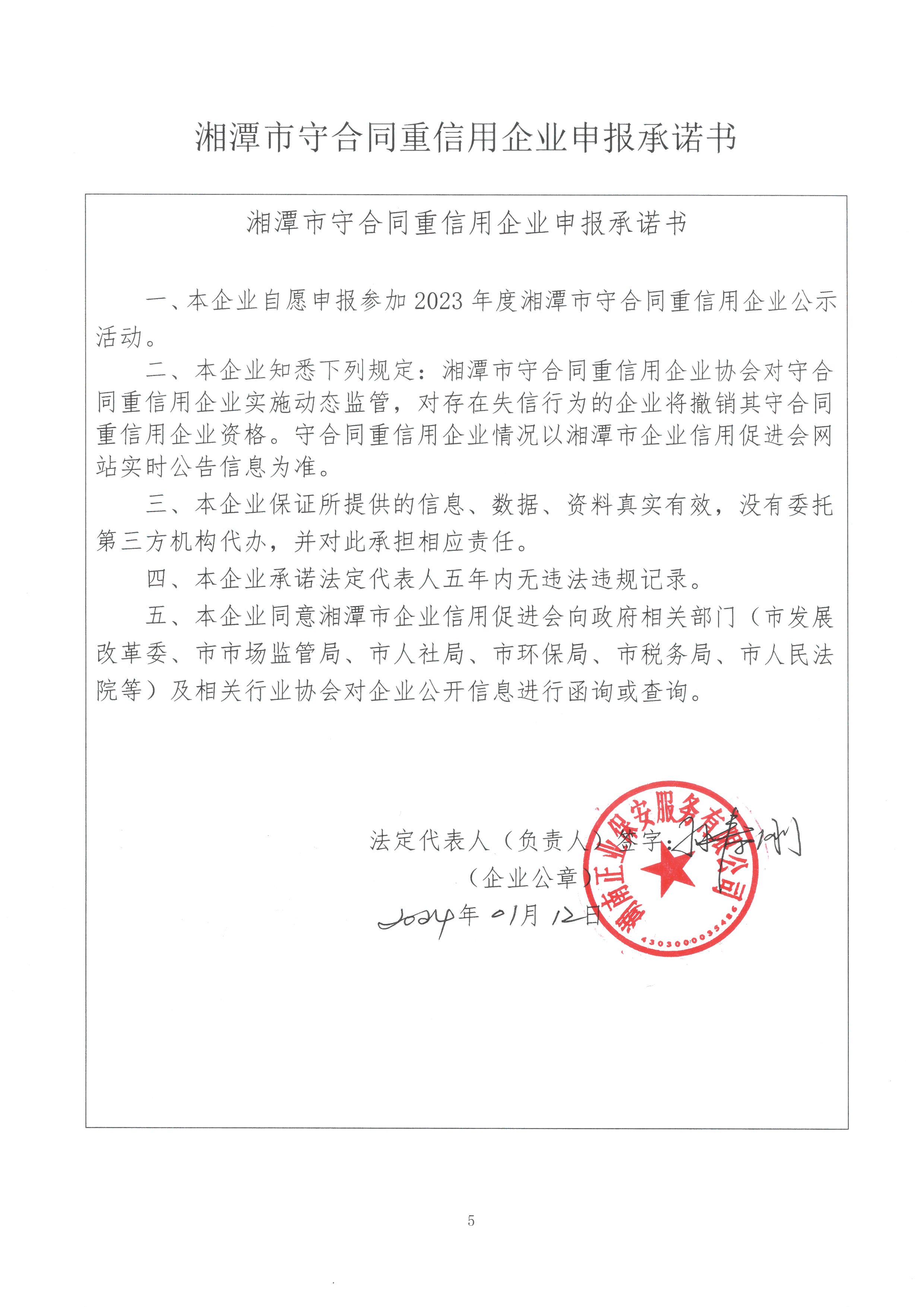 本企業(yè)根據(jù)《湘潭市守合同重信用企業(yè)申報(bào)規(guī)定》等編制 2023 年度企業(yè)信用報(bào)告書,并保證本報(bào)告書內(nèi)容真實(shí)、準(zhǔn)確、完整。