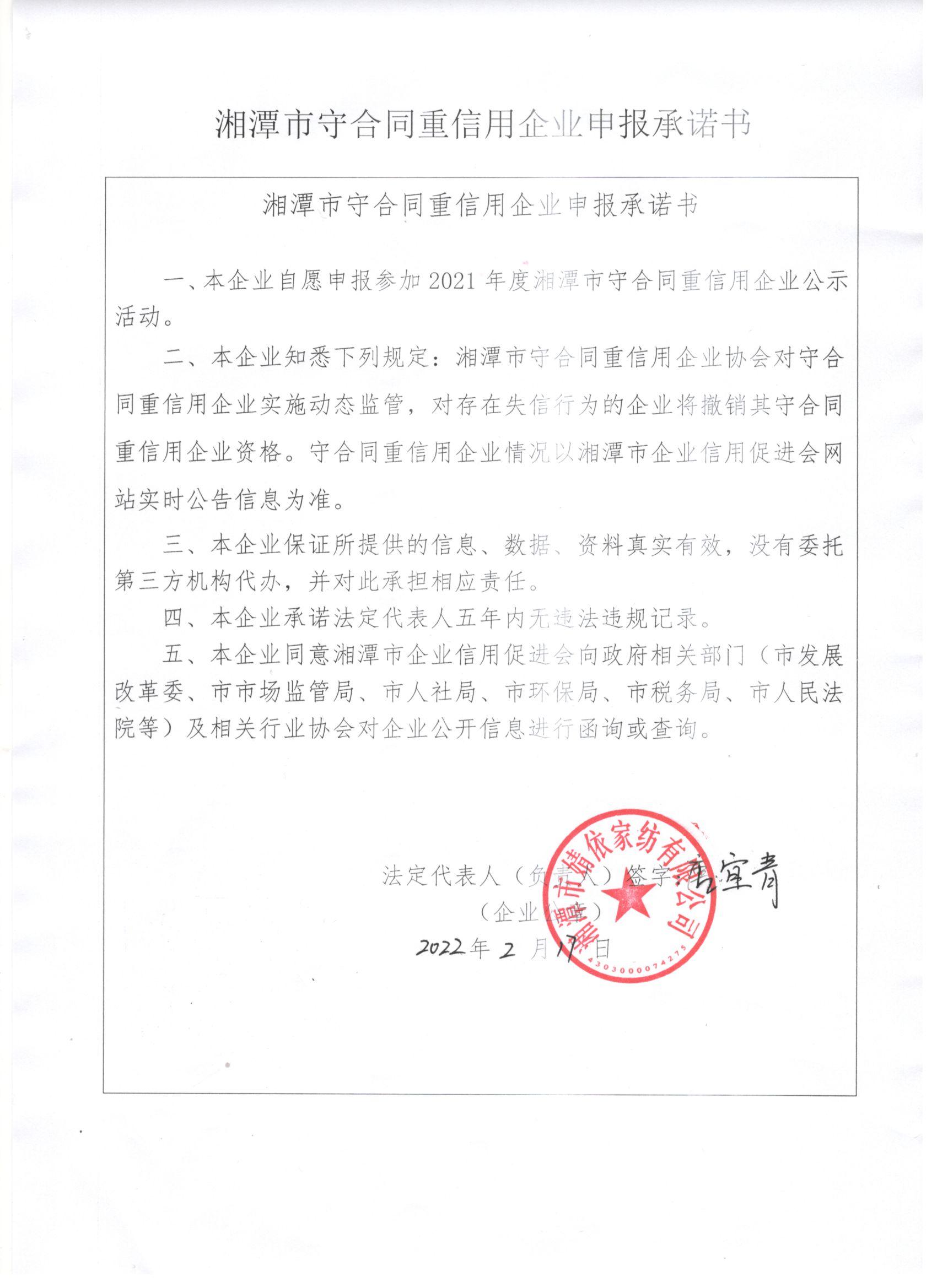 本企業(yè)根據(jù)《湘潭市守合同重信用企業(yè)申報規(guī)定》等編制 2021 年度企業(yè)信用報告書,并保證本報告書內容真實、準確、完整。