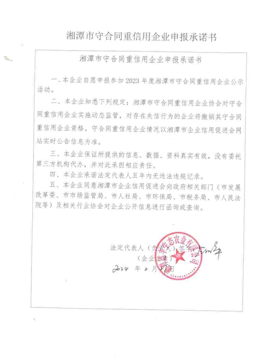 本企業(yè)根據(jù)《湘潭市守合同重信用企業(yè)申報(bào)規(guī)定》等編制 2023 年度企業(yè)信用報(bào)告書(shū),并保證本報(bào)告書(shū)內(nèi)容真實(shí)、準(zhǔn)確、完整。